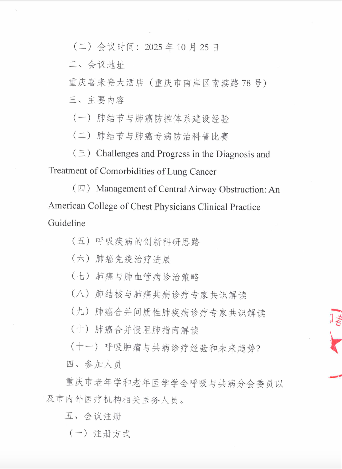 肺结节与肺癌早诊早治前沿创新学术会议暨重庆市⽼年学和⽼年医学学会呼吸与共病分会2025年学术年会的通知