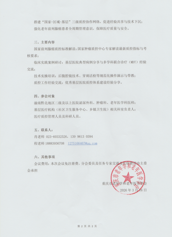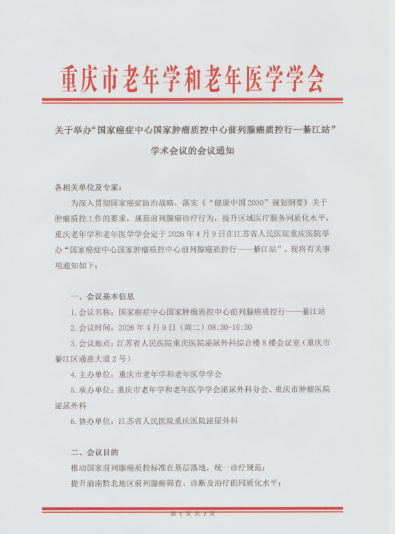 关于举办“2026 年泌尿外科分会基层帮扶(黔江站)暨后腹腔镜技术在基层医院泌尿外科的推广应用”学术会议的第二轮通知